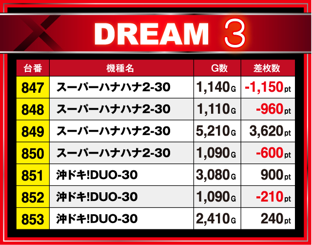 ナ:沖スロコーナーでは『スーパーハナハナ2-30』が1/4、そして『沖ドキ!DUO-30』も2/3でプラス。どちらもそこまで伸びてはいないものの、良い挙動を示していたとのことです。