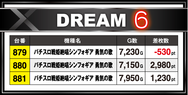 ナ:圧巻は『パチスロ戦姫絶唱シンフォギア 勇気の歌』で、シマ中の3台が7000回転オーバー。1台はマイナスとなりましたが、これだけ回す理由はひとつでしょう。