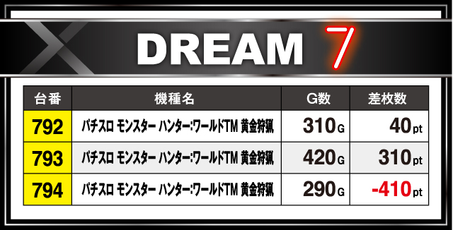 ナ:最後に、『パチスロ モンスター ハンター:ワールドTM 黄金狩猟』。こちらは回転数が伸びず結果が伴っていなかったのですが、もう少し回せていたら違ったデータになっていたかもしれないですね。