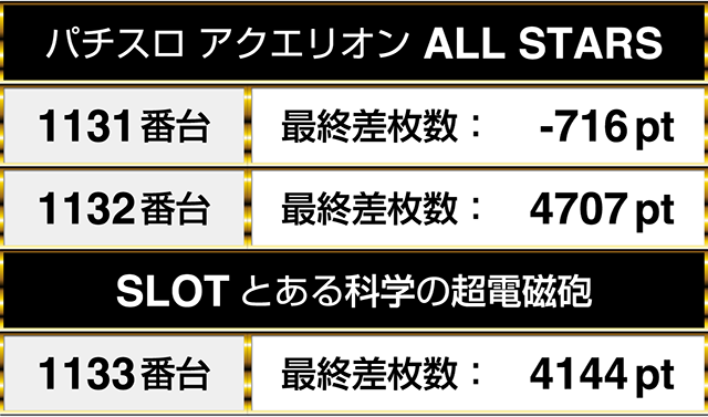 2機種を通してプラスptが並ぶ場所は、『パチスロ アクエリオン ALL STARS』と『SLOTとある科学の超電磁砲』にもあった。