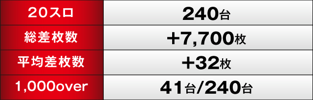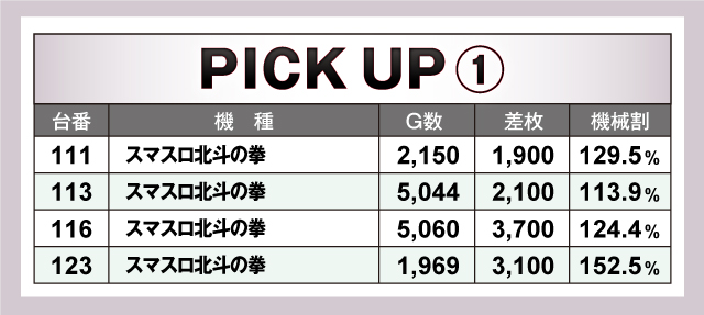 続いては、当日特に賑わっていた機種の中でも、特に注目してもらいたい「スマスロ北斗の拳」を紹介しよう。ピックアップ4台はすべてが+1,000枚オーバーで、そのうち2台は+3,000枚オーバー! 平均差枚も+2,700枚と素晴らしい結果を残していた!