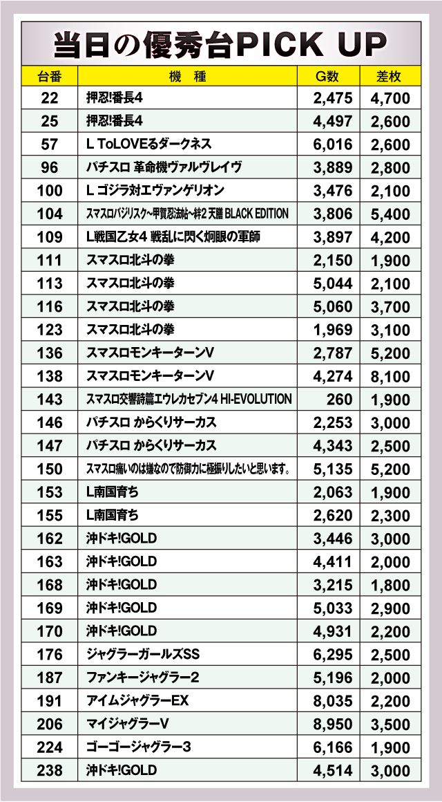 まずは優秀台30台のチェックから。30台のうち25台が+2,000枚オーバーを記録し、+3,000枚オーバーは12台出現。それらのなかでもっとも優秀だったのは、206番台の「スマスロモンキーターンV」で、差枚+8,100枚をマーク! またランクイン機種を見渡すと、「沖ドキ!GOLD」を筆頭に多種多様な機種がランクインしていたので、店内の至る所にチャンスが隠されていた可能性が高そうだ!