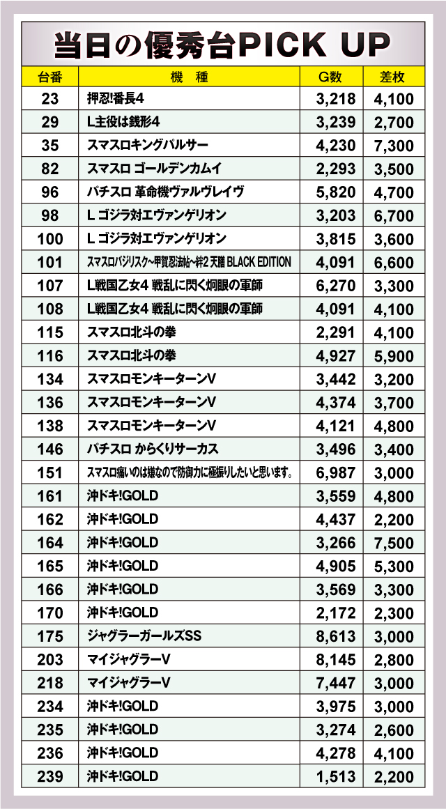 まずは優秀台30台のチェックから。30台すべてが+2,000枚オーバーを記録し、そのうち+3,000枚オーバーは24台出現。それらのなかでもっとも優秀だったのは、164番台の「沖ドキ!GOLD」で、差枚+7,500枚をマーク! またランクイン機種を見渡すと、最優秀台を獲得した「沖ドキ!GOLD」が10台/30台もランクイン! 人気機種に固めてチャンスが投入されていた可能性が高そうだ!