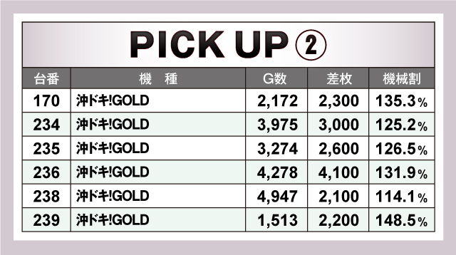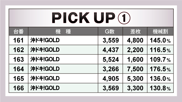続いては、上でも紹介した「沖ドキ!GOLD」の賑わいぶりを紹介していこう。まずは161番台〜166番台の6台並びは、すべてが差枚+1,000枚以上と圧巻の結果で、平均差枚も+4,117枚とトンデモ記録をマーク! またその他の箇所も優秀で、その他としてピックアップした6台すべてが+2,000枚オーバーで、平均差枚も+2,717枚をマーク! 「沖ドキ!GOLD」が当日もっとも店内を盛り上げた機種で間違いなさそうだ!