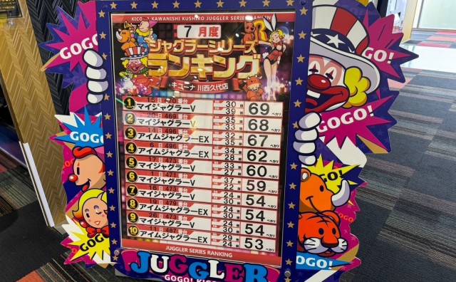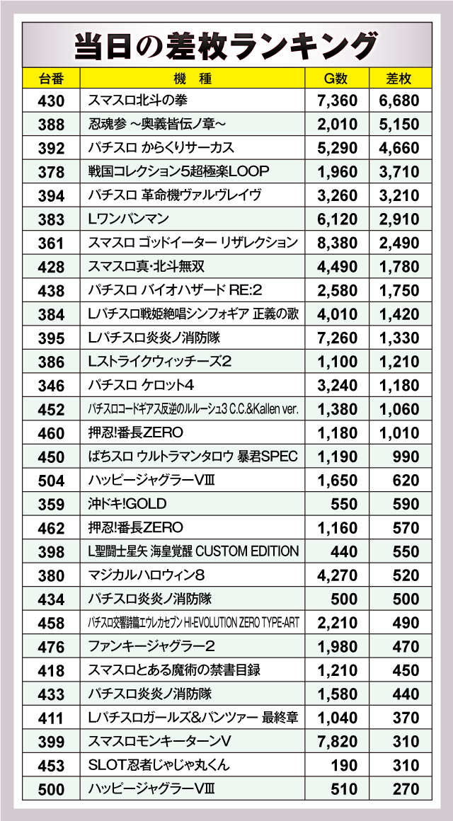 優秀台を見てみると、トップに立ったのは430番台が+6,680枚を記録した『スマスロ北斗の拳』。スマスロの看板機種としての貫録を見せた。それに食い下がったのが+5,150枚をマークした『忍魂参 〜奥義皆伝ノ章〜』388番台。コアなファンの多い機種だが、しっかり人気に応えていた。それに続いたのが+4,660枚の『パチスロ からくりサーカス』392番台。こちらも実力は折り紙付きだ。以下、+3,710枚の『戦国コレクション5超極楽LOOP』378番台、+3,210枚の『パチスロ 革命機ヴァルヴレイヴ』394番台、+2,910枚の『Lワンパンマン』383番台、+2,490枚の『スマスロ ゴッドイーター リザレクション』361番台と続いた。