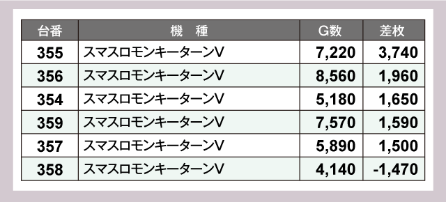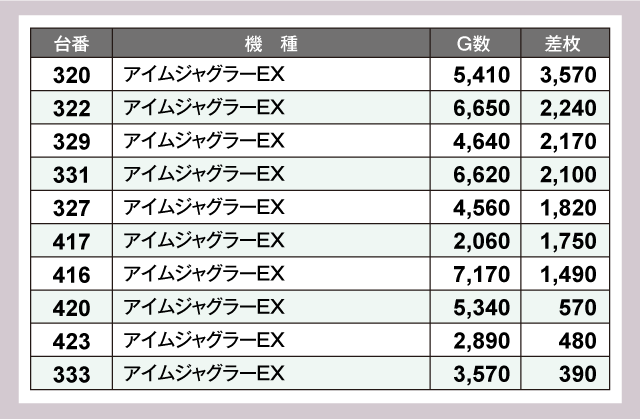 パチスロはなんといっても『アイムジャグラーEX』が大奮闘しており、320番台の+3,570枚を筆頭に好調台を多数確認できた。