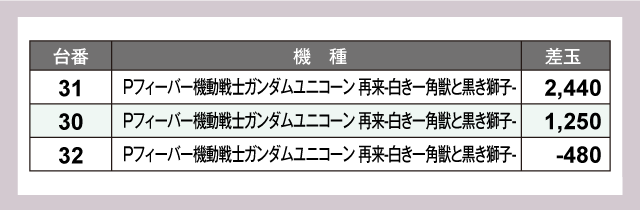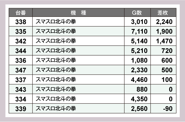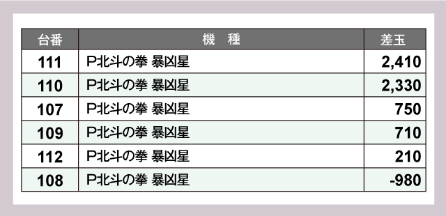 一方、パチンコで注目すべきは『P北斗の拳 暴凶星』で全6台中5台がプラス差玉で終了する見事な結果を残している。
