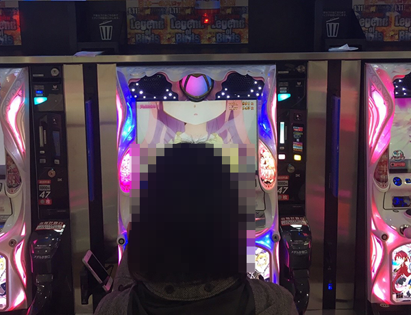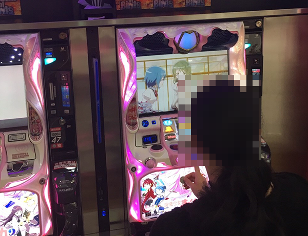 龍の存在を探るべく、ホール内の様子をうかがうと「SLOT魔法少女まどか☆マギカ2」に笑顔のプレイヤーを発見。