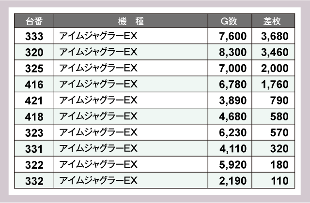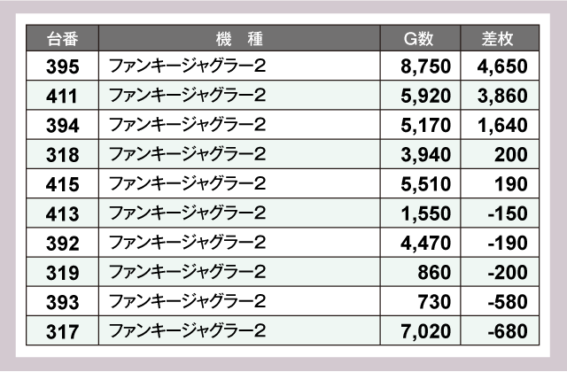 そんな中、メインとなったのはジャグラーシリーズで『アイムジャグラーEX』で+3,000枚超が2台、『ファンキージャグラー2』では+4,650枚を叩き出す盛り上がりを見せいていた。