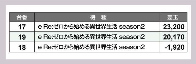 また、パチンココーナーで注目となったのが『e Re:ゼロから始める異世界生活 season2』で3台中2台がプラスで終了。いずれも+20,000発超という圧巻の記録を残している。