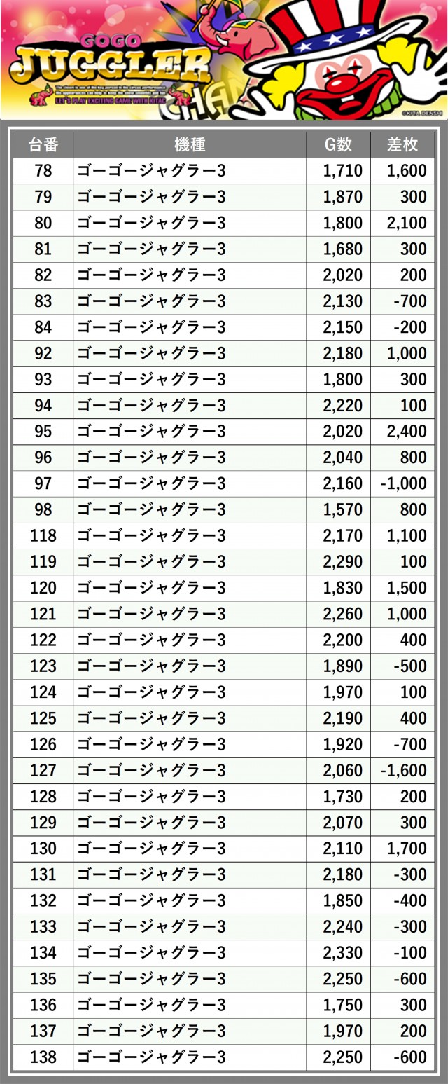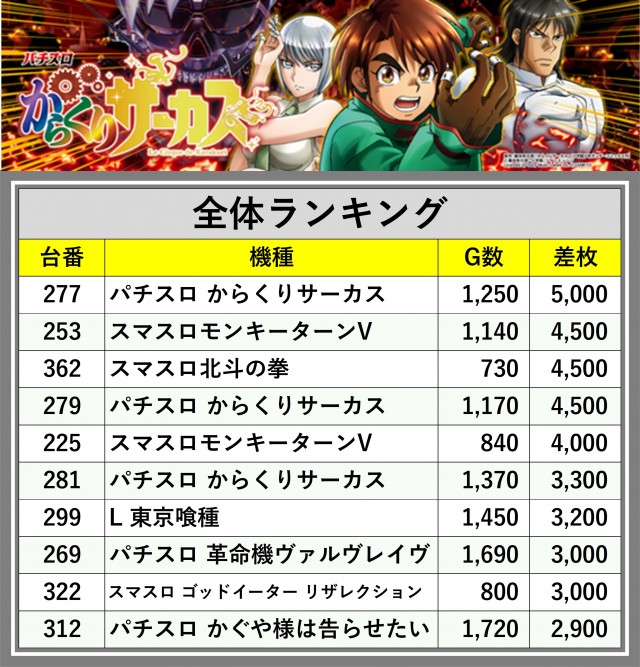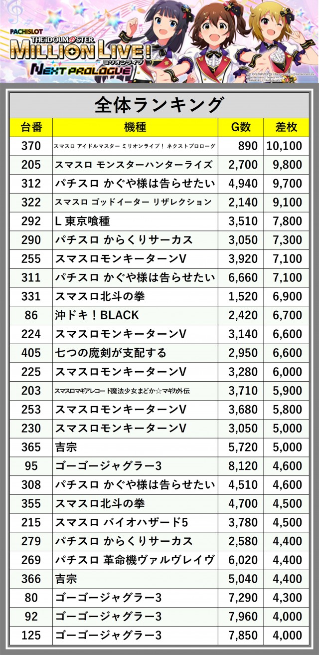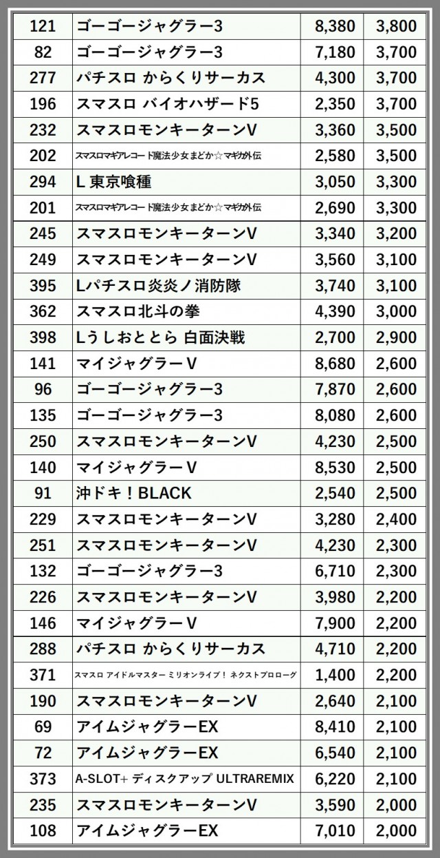 厳選された取材対象機種をはじめ、その他スロット全体から好記録が飛び出した!プレイヤーが楽しんだ1日を下記データにて振り返ってみて欲しい。