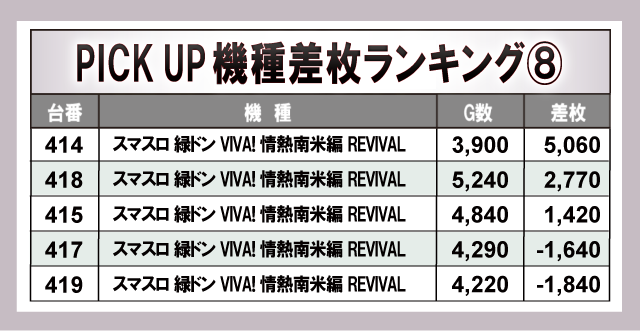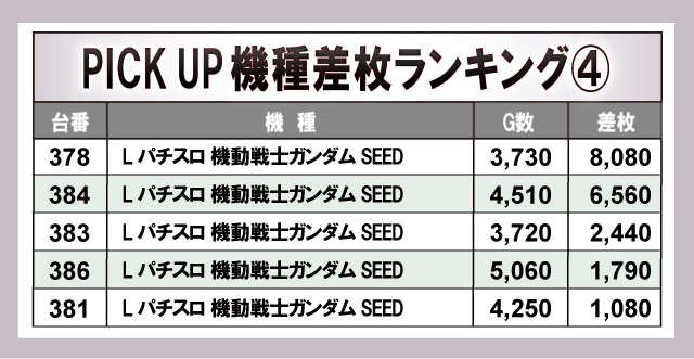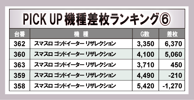 上表の8機種はいずれも活気と熱気に溢れており、当日の店内を盛り上げる存在になっていたのは間違いない。『スマスロ北斗の拳』は10台以上のまとまった出玉を確保しており、安定した結果を残していることがわかる。新台『いざ!番長』も5台中4台がプラス差枚をマークし、さっそく優秀機種として活躍を披露。上表を見ての通り、良い内容であったことから、AT機・ノーマル機のどちらにもチャンスが用意されていた!