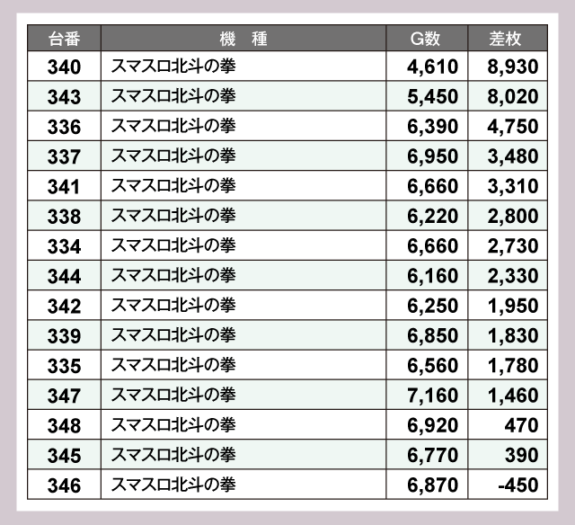 ひときわ盛り上がっていたのはパチスロコーナー。『スマスロ北斗の拳』は15台中14台がプラス差枚と、かなりの好成績をおさめている。とくに340番台が+8,930枚、343番台が+8,020枚と誰もがうらやむ差枚に。以下336番台の+4,750枚、337番台の+3,480枚などなど、見応えのあるデータになっている。