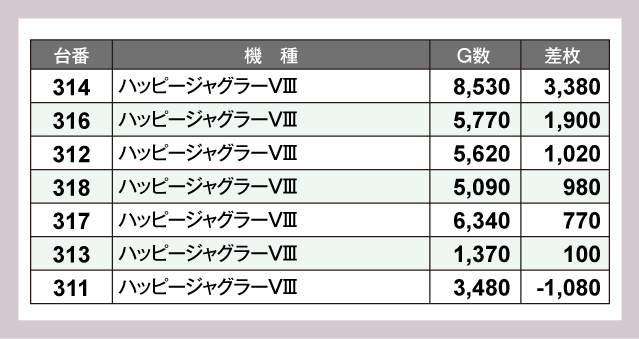 『ハッピージャグラーVⅢ』は6台がプラス差枚。とくに314番台は8,530Gも回されていて、+3,380枚の大成果をあげていた。