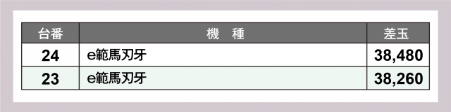 一方、4パチでは新台の『e範馬刃牙』2台ではどちらも+38,000個オーバーを達成し、デビュー間もないが確かな躍進を遂げていたようだ。