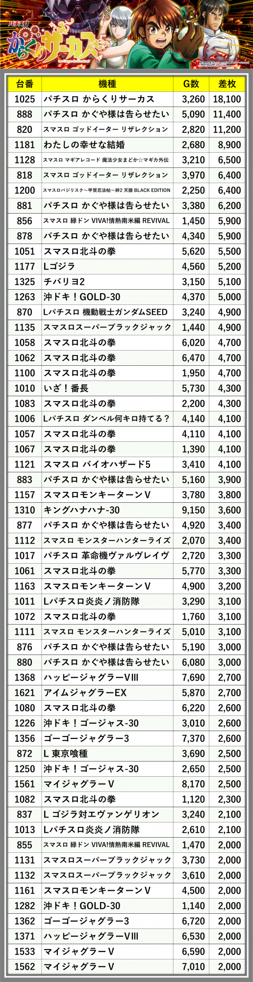 厳選された取材対象機種をはじめ、その他スロット全体から好記録が飛び出した!プレイヤーが楽しんだ1日を下記データにて振り返ってみて欲しい。