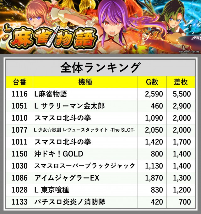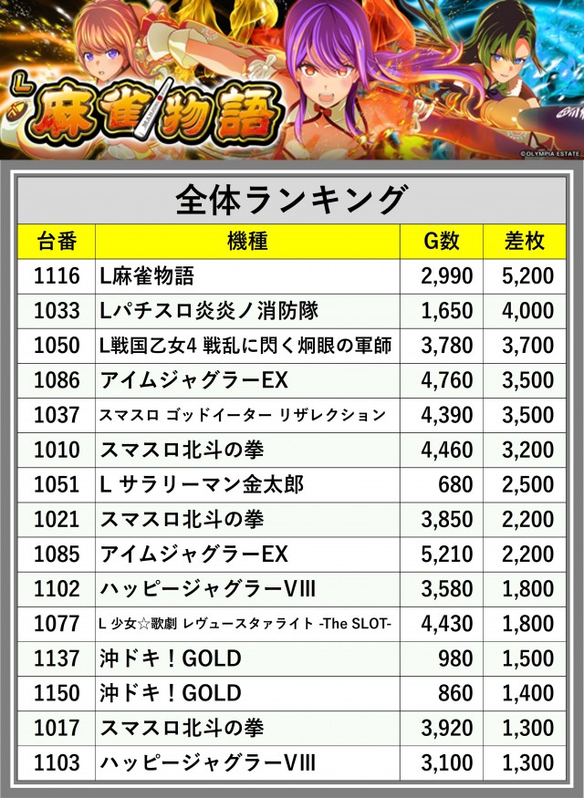 ※差枚数順に掲載しています