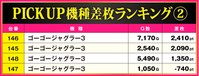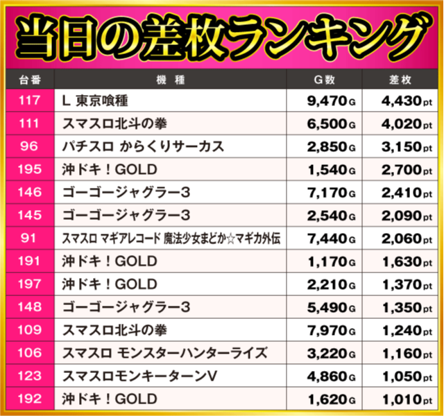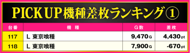 この日は、『L 東京喰種』と『スマスロ北斗の拳』が+4,000pt超、『パチスロ からくりサーカス』が+3,150ptを記録するなど、人気のスマスロを中心にハイスコアが発生。さらに、Aタイプ機種では『ゴーゴージャグラー3』が奮闘しており、差枚TOP10に3台がランクインしている。