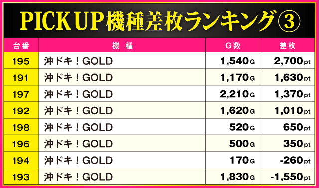 今回のPICK UP機種は全3機種で、差枚上位にランクインした台以外からも複数の好調台を確認。最終的に3機種トータルの全14台中10台がプラス差枚となっているだけに、それぞれのシマは常に活気とファンの笑顔に溢れ返っていた。