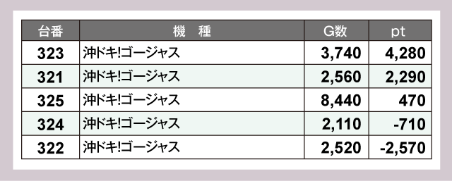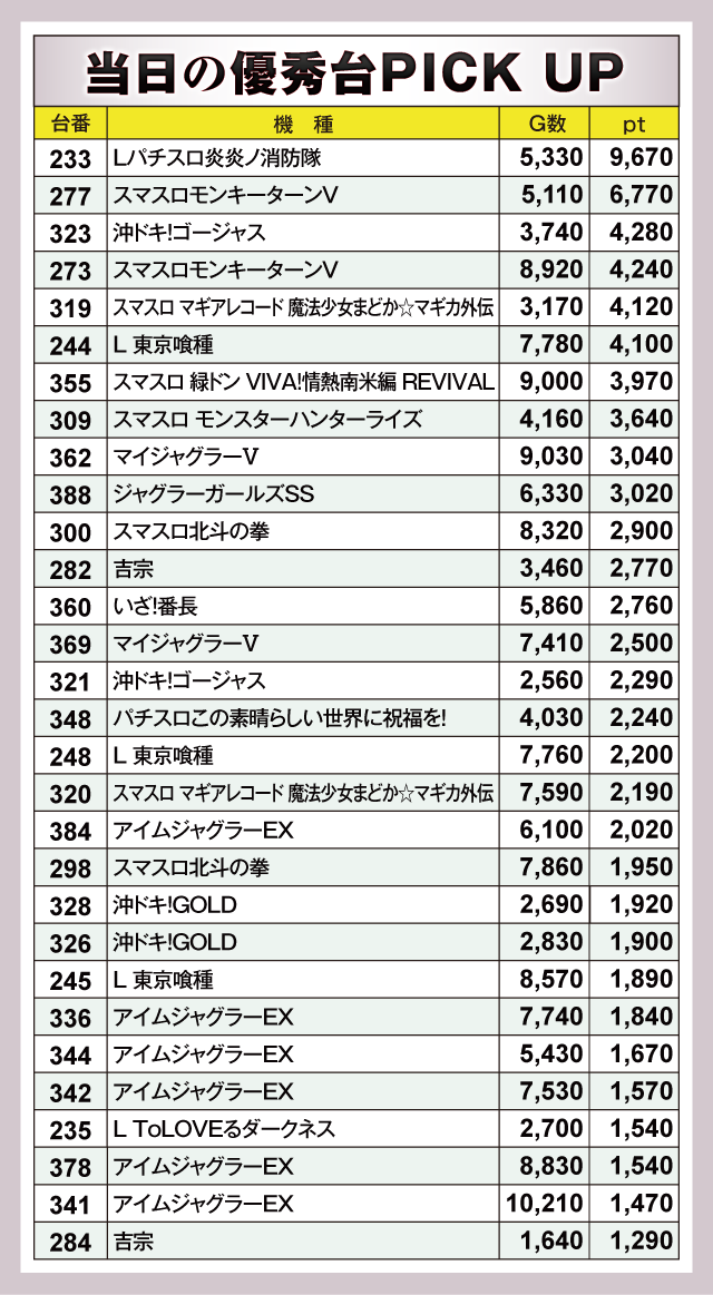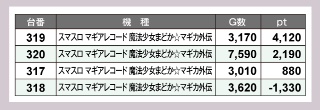 『スマスロ マギアレコード 魔法少女まどか☆マギカ外伝』と『沖ドキ!ゴージャス』からは4,000pt・2,000ptオーバーの優秀台が誕生している。