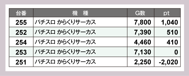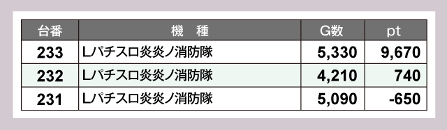 『パチスロ からくりサーカス』は5台中3台がプラス。『Lパチスロ炎炎ノ消防隊』は3台中2台がプラスで、233番台が9,000pt超えの大成果をあげていた。