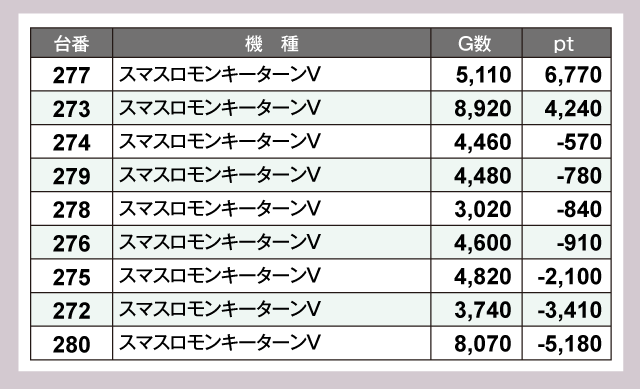 『スマスロモンキーターンV』はプラスの2台がかなりの好成績。全体的に稼働も高く、定番人気機種としてのポテンシャルを発揮している。