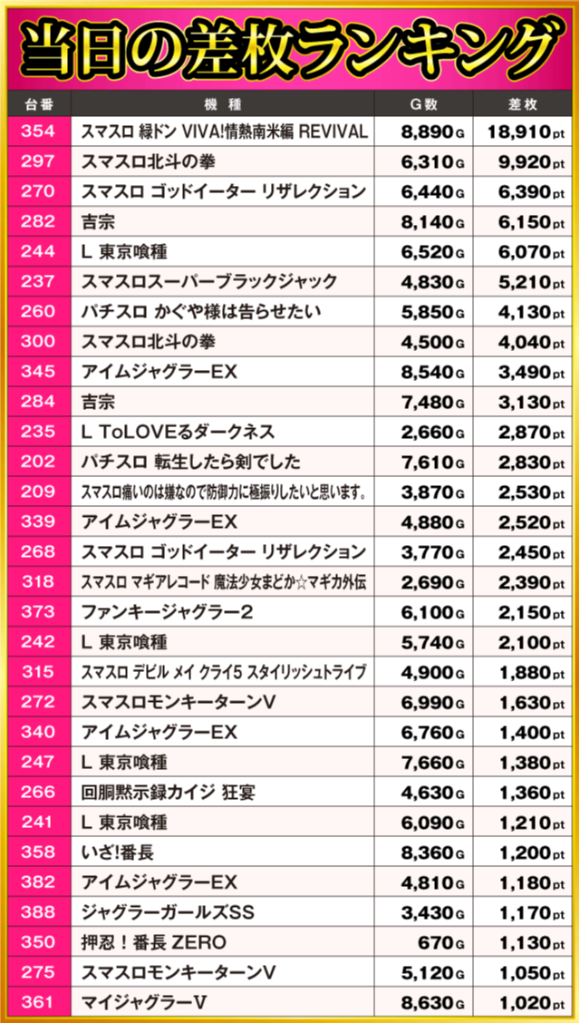 この日は、『スマスロ 緑ドン VIVA!情熱南米編 REVIVAL』が怒涛の+18,910ptを叩き出し堂々のランキングトップに。次いで『スマスロ北斗の拳』が万枚目前の+9,920ptを記録。さらに『スマスロ ゴッドイーター リザレクション』と『吉宗』、『L 東京喰種』から+6,000pt超が発生するなど、人気のスマスロを中心に好成績が続出している。