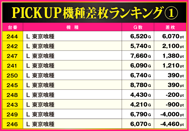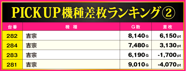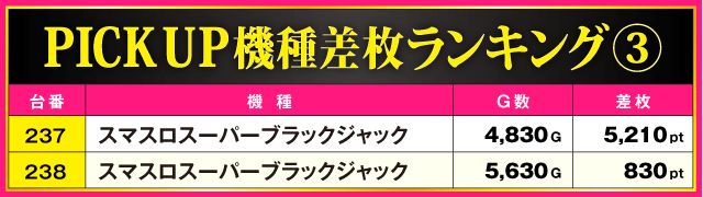 今回のPICK UP機種は全3機種。ハイスコアが飛び出した『L 東京喰種』と『吉宗』以外にも『スマスロスーパーブラックジャック』から+5,210ptが確認されている。しかも、最終的に3機種トータルの全16台中10台がプラス差枚となっているだけに、それぞれのシマは常にファンの笑顔と活気に満ち溢れていた。