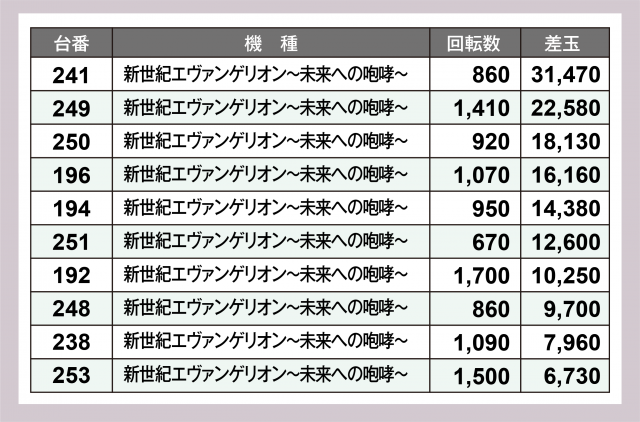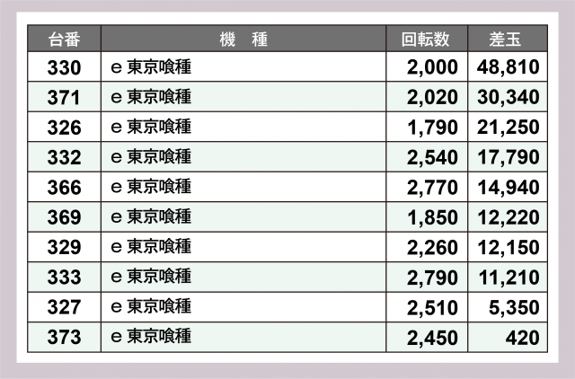 対してパチンコでは『新世紀エヴァンゲリオン〜未来への咆哮〜』『e 東京喰種』がスマスロに匹敵する出玉を残し、5桁プラスの多さが光った。