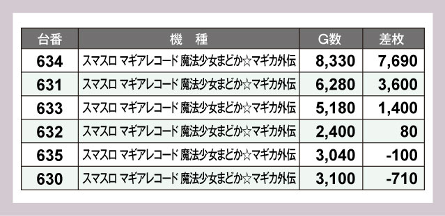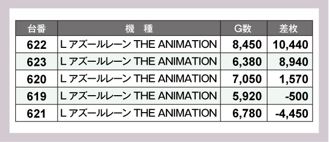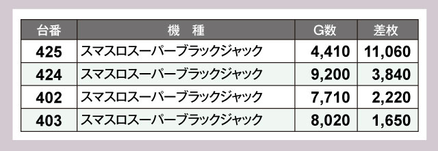パチスロコーナーでとくに輝いていたのは『スマスロスーパーブラックジャック』。425番台が+11,060枚と見事な成績を残している。『L アズールレーン THE ANIMATION』も活況で万枚達成台があらわれた。『スマスロ マギアレコード 魔法少女まどか☆マギカ外伝』からも優秀台が多数誕生。ホール内の盛り上がりにひと役かっている。