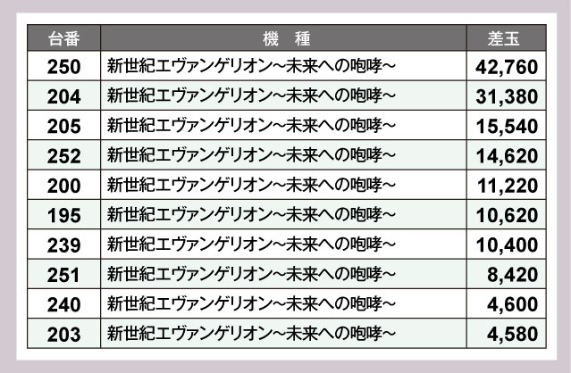 パチンココーナーでは定番機種の『新世紀エヴァンゲリオン〜未来への咆哮〜』と『P北斗の拳 暴凶星』がにぎやかな状況となっていて、それぞれ3万発・4万発クラスが誕生。根強い人気とポテンシャルを発揮していた。