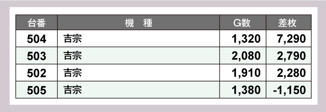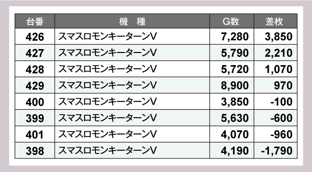 今回、パチスロコーナーでは『スマスロモンキーターンV』から多数の好調台を確認。426番台の+3,850枚をはじめ全8台中4台がプラス差枚となる見事な結果を残している。また、『吉宗』からも504番台の+7,290ptを筆頭に好成績が続出しており、両機種のシマは常に活気に包まれる一日となった。