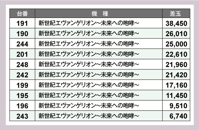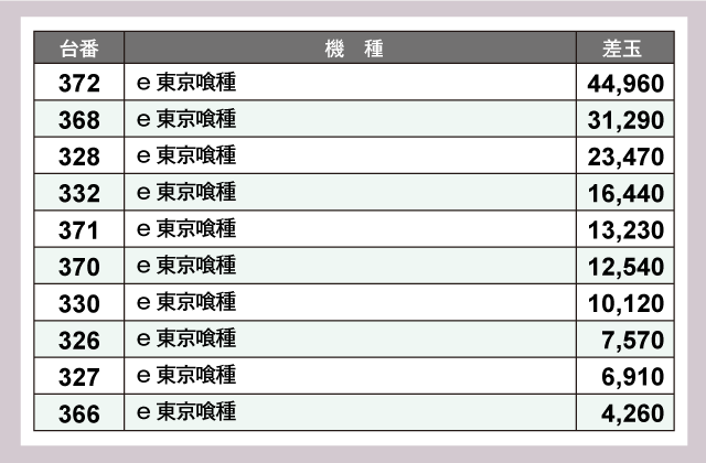 一方、パチンココーナーでプレイヤーの注目を集めていたのが『e 東京喰種』で、372番台が怒涛の+44,960発を記録。さらに、『新世紀エヴァンゲリオン〜未来への咆哮〜』からは+20,000発超が6台、『Pスーパー海物語 IN 沖縄5』からは+10,000発超が5台も発生する盛況ぶりにファンも大満足だったようだ。