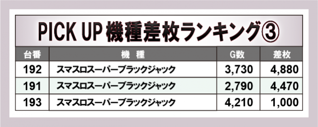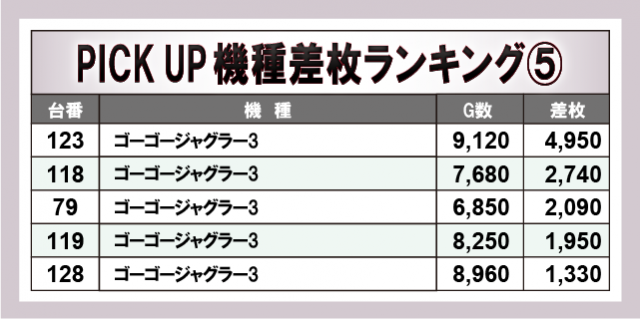 優秀機種として取り上げた5機種からしっかりとポテンシャルを解放していた様子が窺える。『スマスロモンキーターンV』では万枚OVERを筆頭に5,000枚OVERが多数発生し、『スマスロスーパーブラックジャック』では設置3台全てがプラス差枚を記録しており、機種単位での盛り上がりが印象的な結果となった!またスマスロ機の活躍が目立つ一方で、『ゴーゴージャグラー3』もコンスタントに大当りを重ね、店内の盛り上がりに大きく貢献していた!