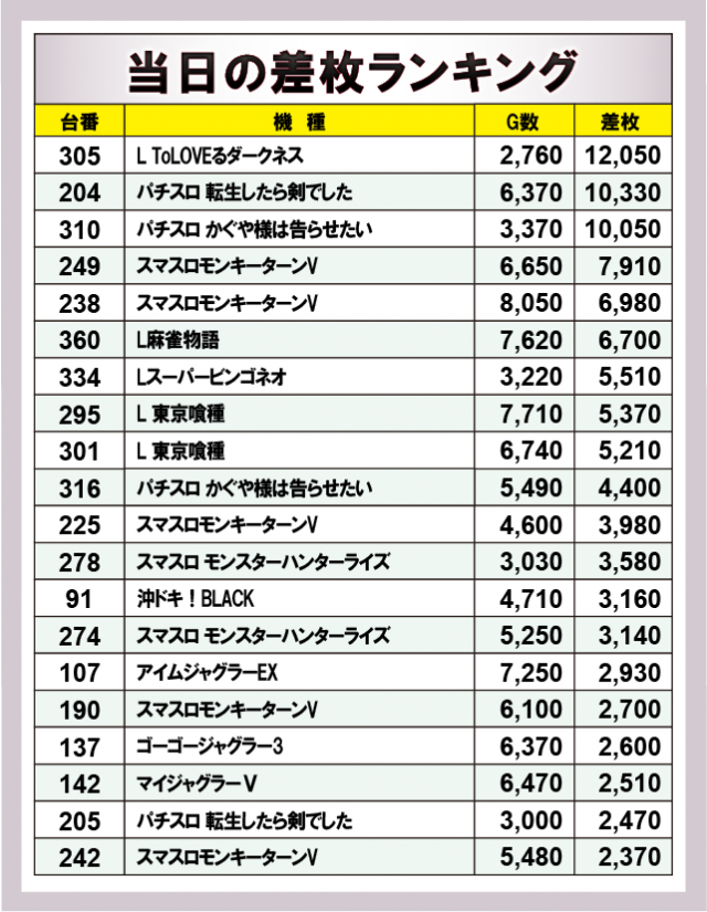 まずは「玉屋409雑餉隈」全体差枚ランキングの発表だ!