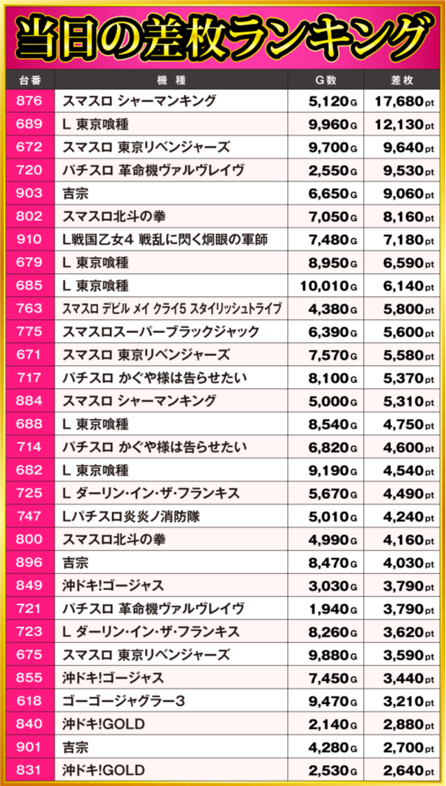 当日の差枚ランキング