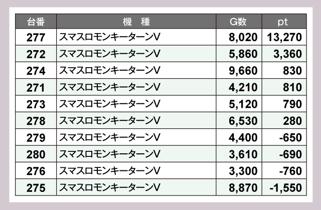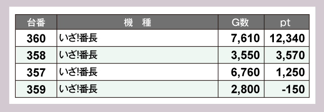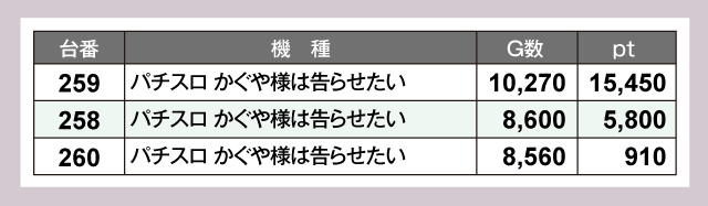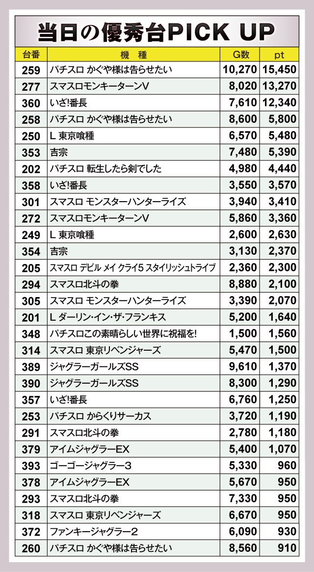 『パチスロ かぐや様は告らせたい』259番台が+15,450ptと、頭ひとつ飛びぬけた成績を残していた。そして『スマスロモンキーターンV』277番台が+13,270pt、『いざ!番長』360番台が+12,340ptと、計3台が1万ptオーバーを達成している。以下『パチスロ かぐや様は告らせたい』258番台の+5,800pt、『L 東京喰種』250番台の+5,480pt、『吉宗』353番台の+5,390ptなど優秀台が多数誕生。見応えのあるptがズラリと並ぶ、豪華なデータが仕上がっていた。