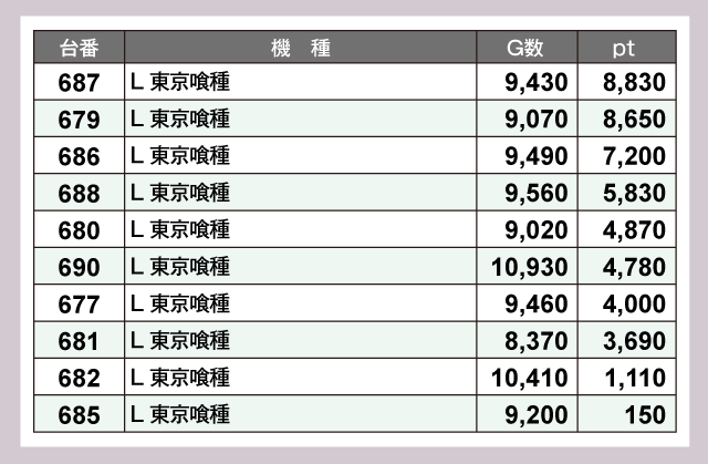いまやメイン機種の『L 東京喰種』は全台が高稼働。1万G超えが2台もあらわれ、pt的にも大幅プラスの台が多数誕生している。