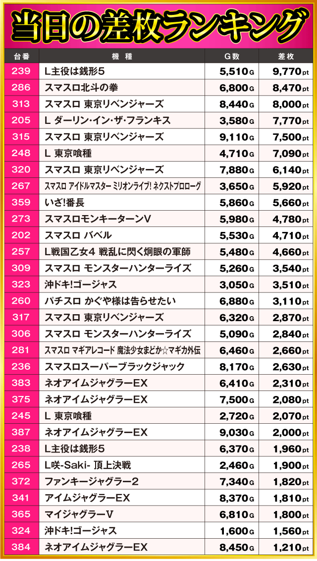 この日は、人気のスマスロを中心に多数の好調台を確認。そんな中、『L主役は銭形5』が万枚目前の+9,770ptを叩き出しランキングトップに。次いで『スマスロ北斗の拳』が+8,470pt、『スマスロ 東京リベンジャーズ』が+8,000pt、さらに『L ダーリン・イン・ザ・フランキス』を含む3台が+7,000pt超を記録し店内を盛り上げていた。