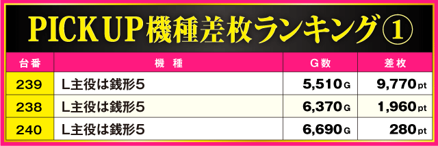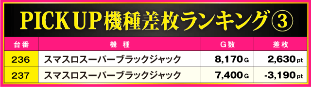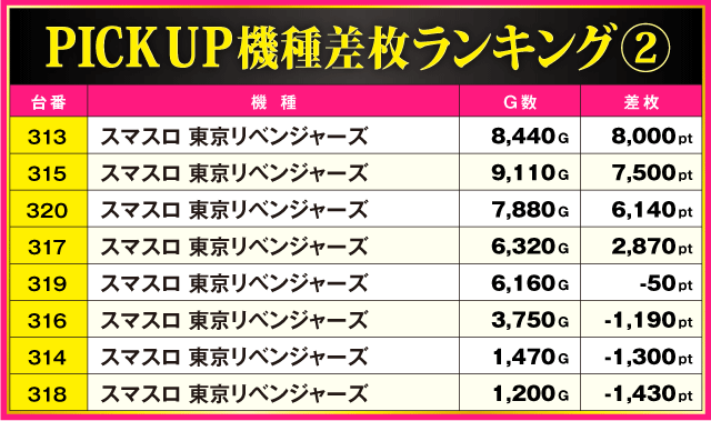 今回のPICK UP機種は全3機種。『L主役は銭形5』は3台すべてがプラスで総差枚も大幅プラスとなった。『スマスロ 東京リベンジャーズ』からは+6,000pt超が3台と大活躍。『スマスロスーパーブラックジャック』からは+2,000pt超が発生している。さらに、3機種トータルの全13台中8台がプラス差枚となっているだけに、それぞれのシマは常に活気に満ち溢れる一日となった。