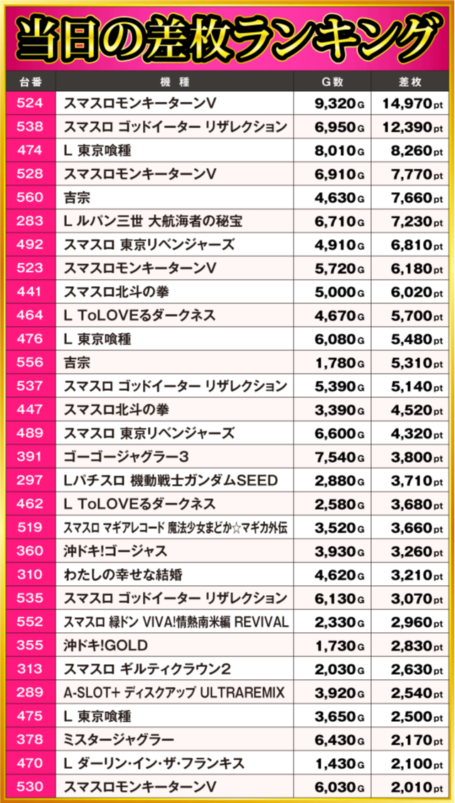 この日は、多台数の主力機種からバラエティコーナー、さらにはノーマルタイプに至るまで、広範囲に渡って多数の好調台を確認。そんな中、『スマスロモンキーターンV』が+14,970pt、『スマスロ ゴッドイーター リザレクション』が+12,390ptを叩き出しプレイヤーの注目を集めていた。