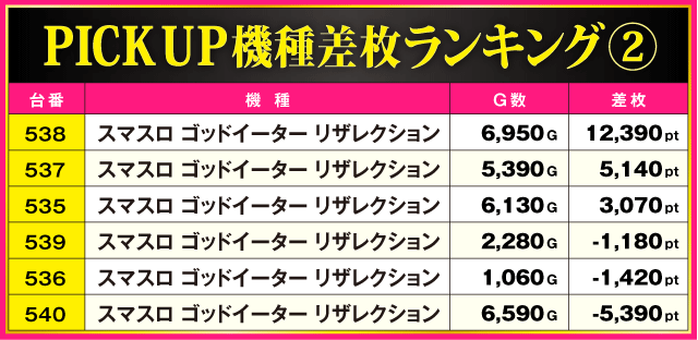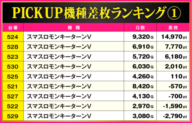今回のPICK UP機種は全3機種で、ハイスコアを記録した台以外からも多数の好調を確認。『スマスロモンキーターンV』からは+7,770ptに+6,180pt、『スマスロ ゴッドイーター リザレクション』からは+5,140ptが発生しているだけに、それぞれのシマは常にファンの笑顔と活気に満ち溢れる一日となった。