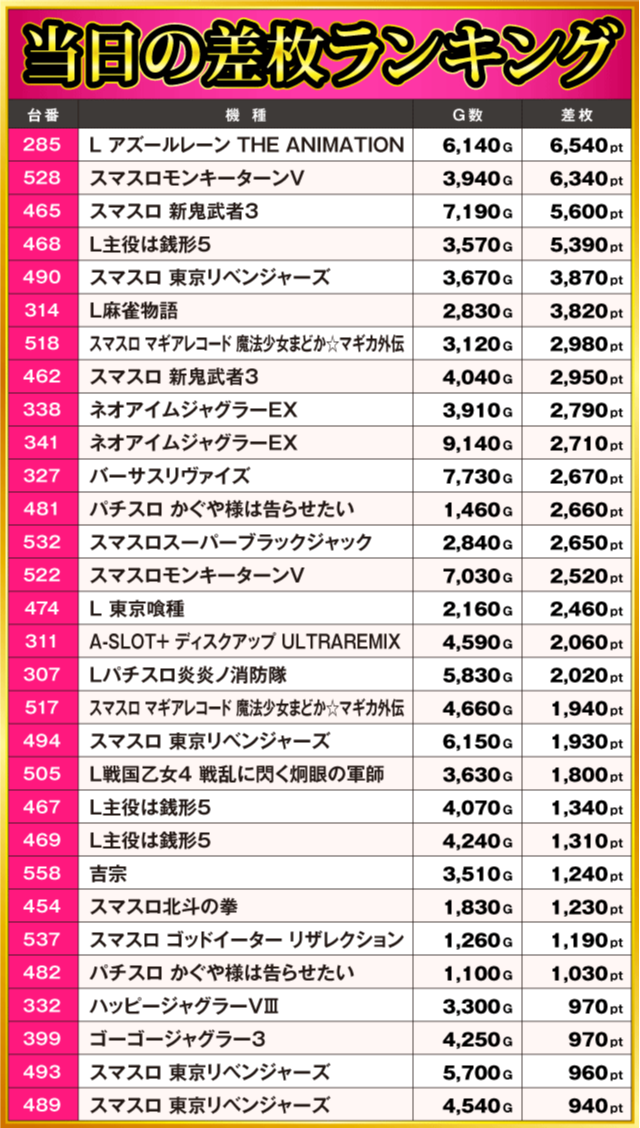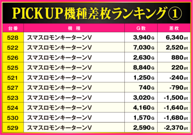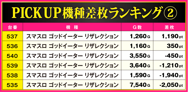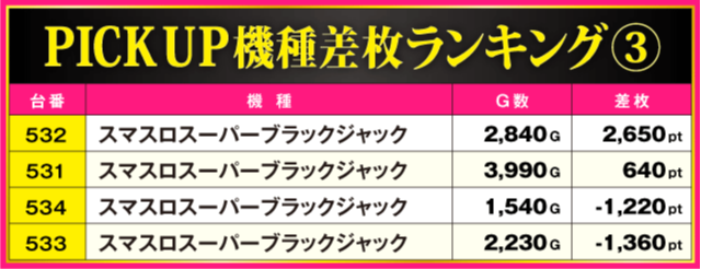 次にPICK UP機種の状況を見ていくと、差枚上位にランクインした『スマスロモンキーターンV』以外にも、『スマスロ ゴッドイーター リザレクション』から+1,190pt、『スマスロスーパーブラックジャック』から+2,650ptといった好成績を確認。また、3機種トータルの全20台のうち8台がプラス差枚となっている。