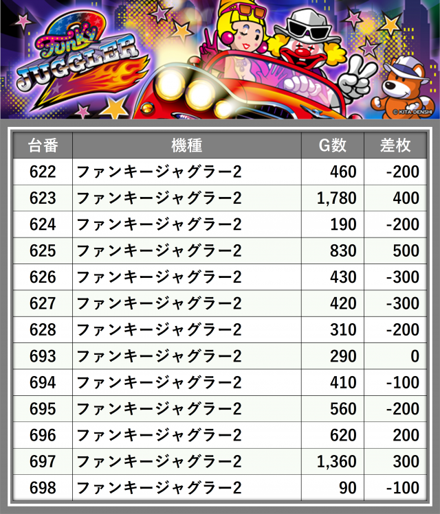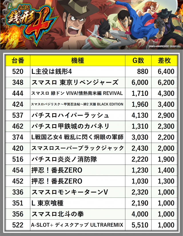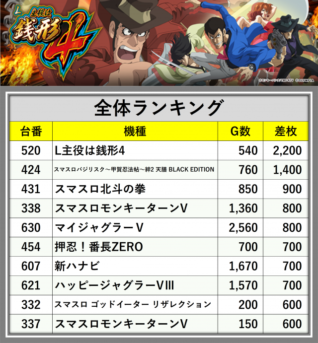 厳選された取材対象機種をはじめ、その他スロット全体から好記録が飛び出した!プレイヤーが楽しんだ1日を下記データにて振り返ってみて欲しい。
