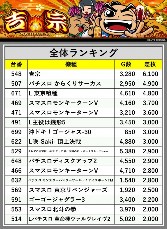 厳選された取材対象機種をはじめ、その他スロット全体から好記録が飛び出した!プレイヤーが楽しんだ1日を下記データにて振り返ってみて欲しい。