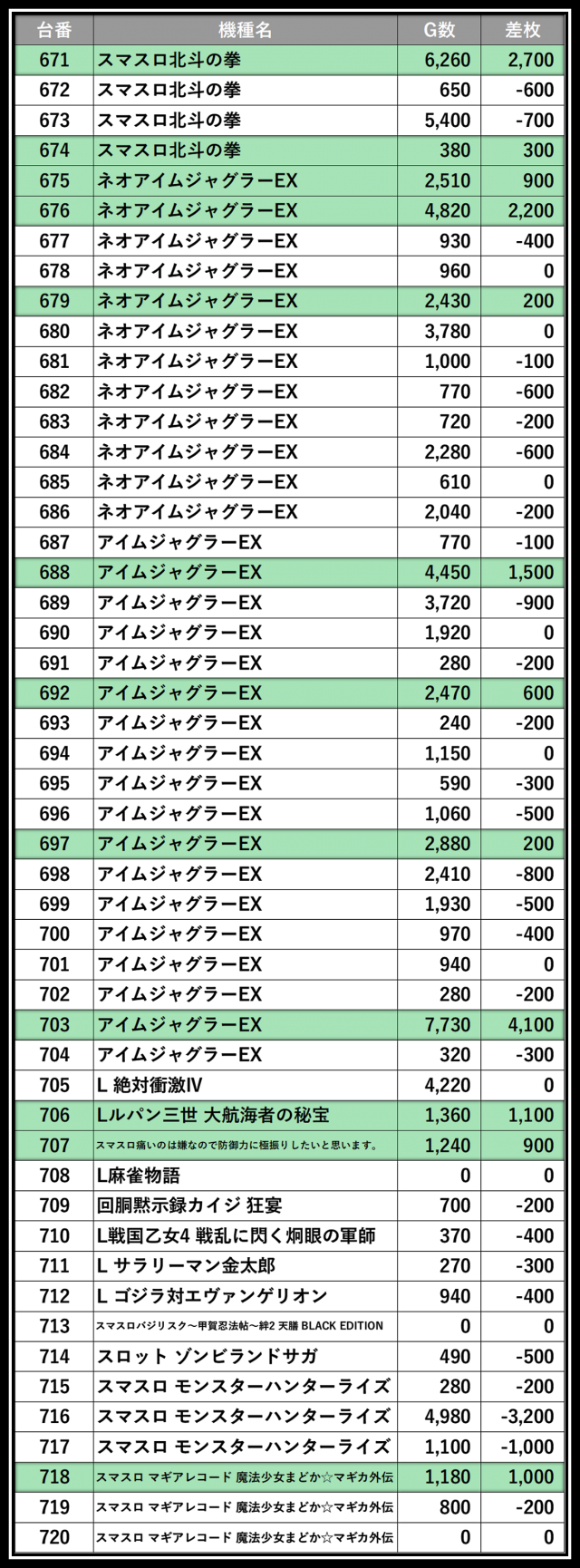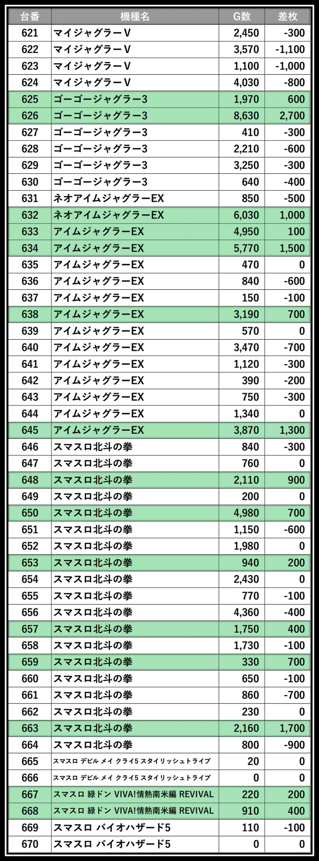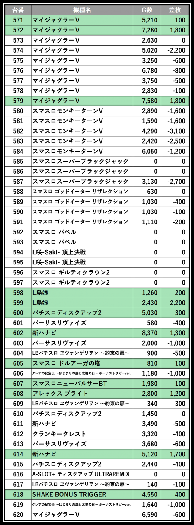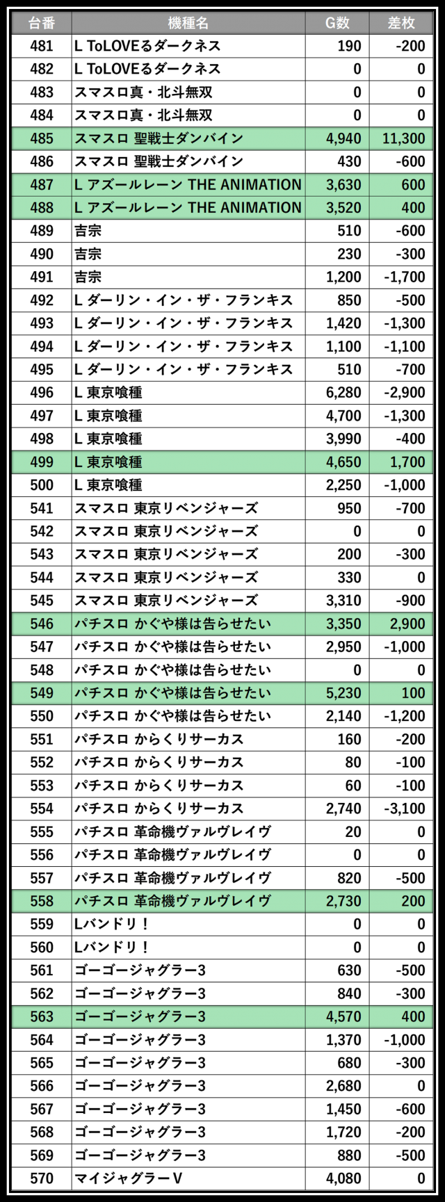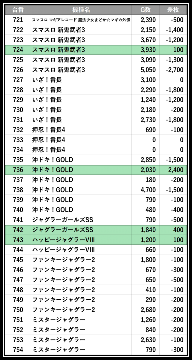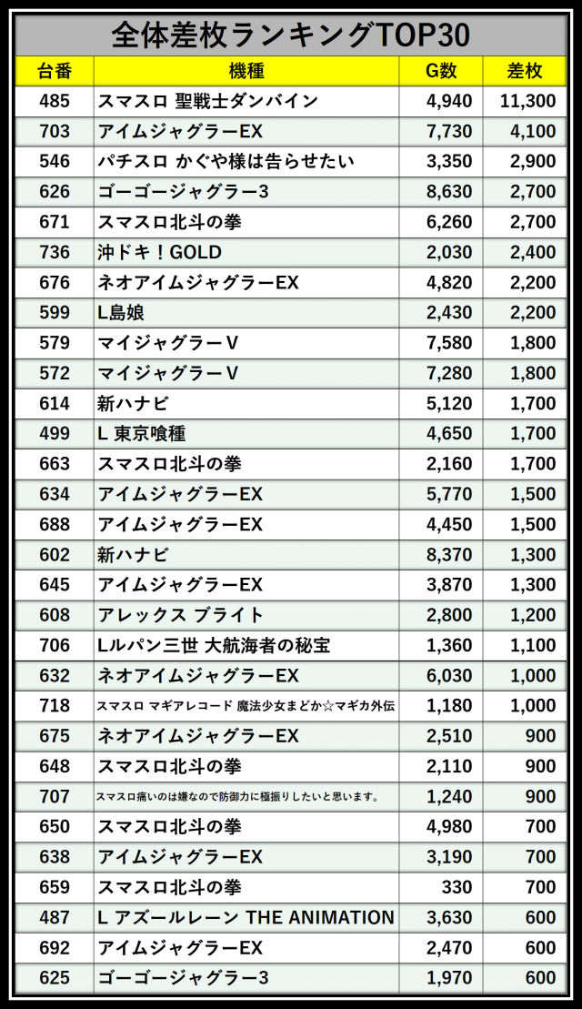 ※差枚数順に掲載しています