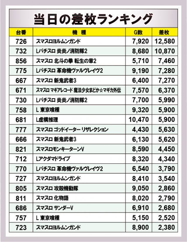 差枚ランキングを見ると、新台『スマスロヨルムンガンド』が+12,580枚でトップを獲得し、『Lパチスロ 炎炎ノ消防隊2』も+10,870枚と万枚OVERを記録。さらに『スマスロ 北斗の拳 転生の章2』『Lパチスロ 革命機ヴァルヴレイヴ2』『スマスロ 新鬼武者3』など主力どころを中心に高差枚で続き、各所で凄まじい盛り上がりをみせていた。加えて万回転超を筆頭に高稼働台も多数確認でき、機種単位での厚みやフロア全体への広がりもうかがえる!
