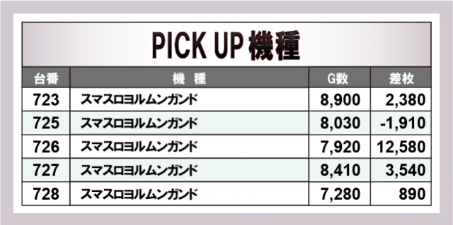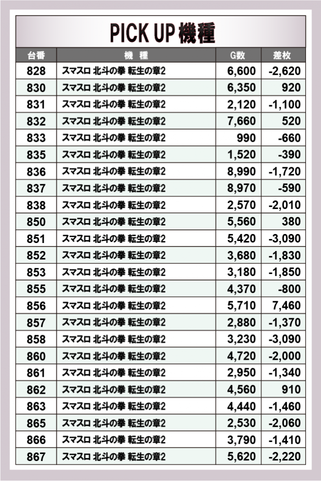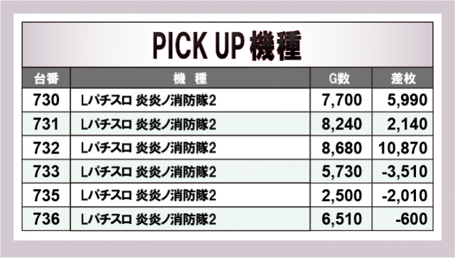 PICK UP機種を見ていくと、『スマスロヨルムンガンド』は5台中4台プラス差枚とまとまりある結果を披露し、『Lパチスロ 炎炎ノ消防隊2』も万枚OVERを含む複数好結果で存在感を発揮。加えて『スマスロ 北斗の拳 転生の章2』が広く打ち込まれつつ、+7,460枚を筆頭に見せ場を形成。全体を通して主役級3機種がそれぞれ異なる形で盛り上がりを演出していた。