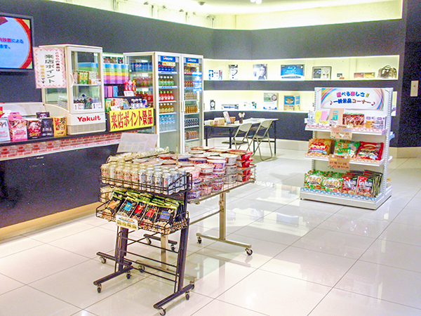 景品コーナーはお酒・インスタント食品・お菓子など、品揃えが充実。遊技後のおみやげ選びが楽しくなりそうだ。
