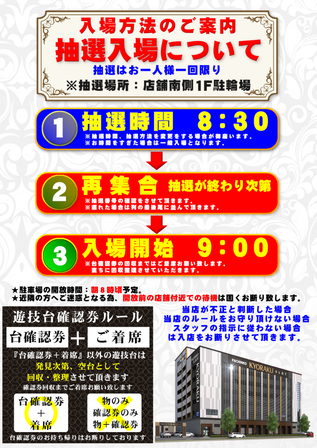 店内POP、店舗HP、LINE等に掲載した時間までにお集りの方を対象に抽選開始。 ※都合により、急遽時間を変更する可能性がございます。 |